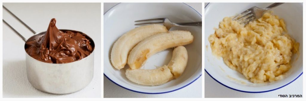 שוקולד שחר או נוטלה ובקערית נפרדת מועכים באמצעות מזלג שלוש בננות בינוניות בשלות. בקערה גדולה טורפים