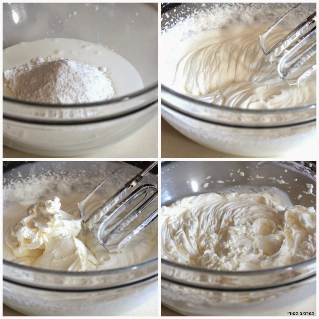 ואבקת סוכר עד שהשמנת מתחילה להסמיך. מוסיפים גבינת מסקרפונה וממשיכים להקציף עד