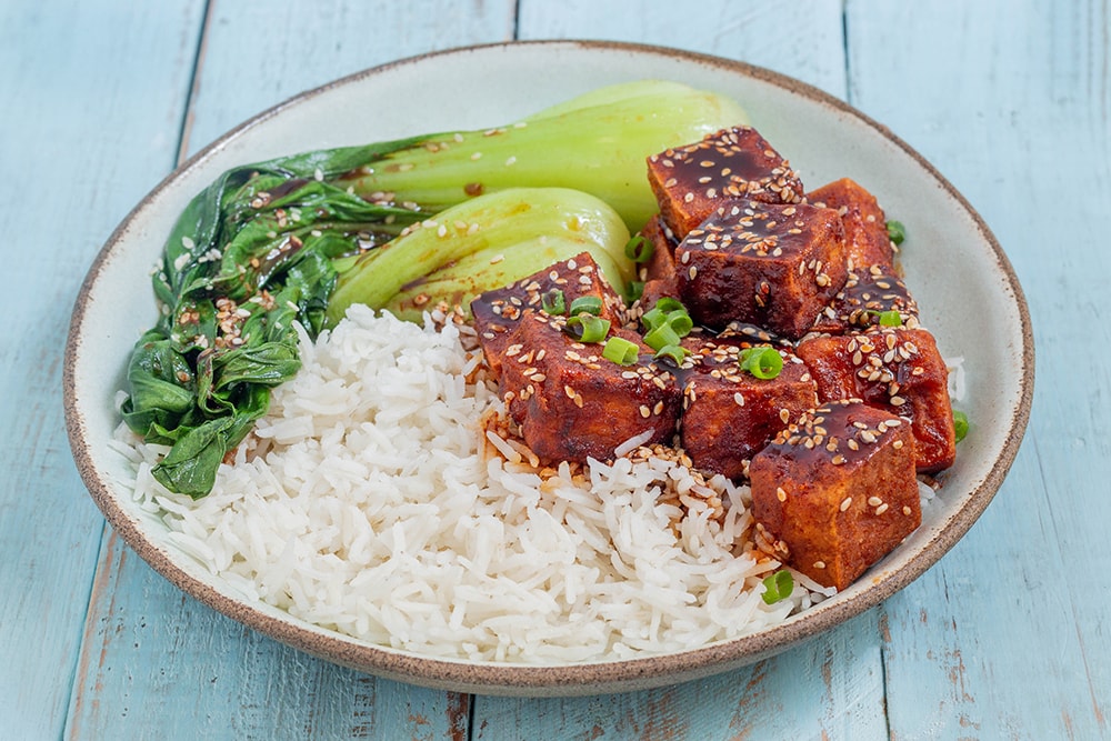 טופו מוקפץ ברוטב שומשום עם אורז ובוק צ'וי